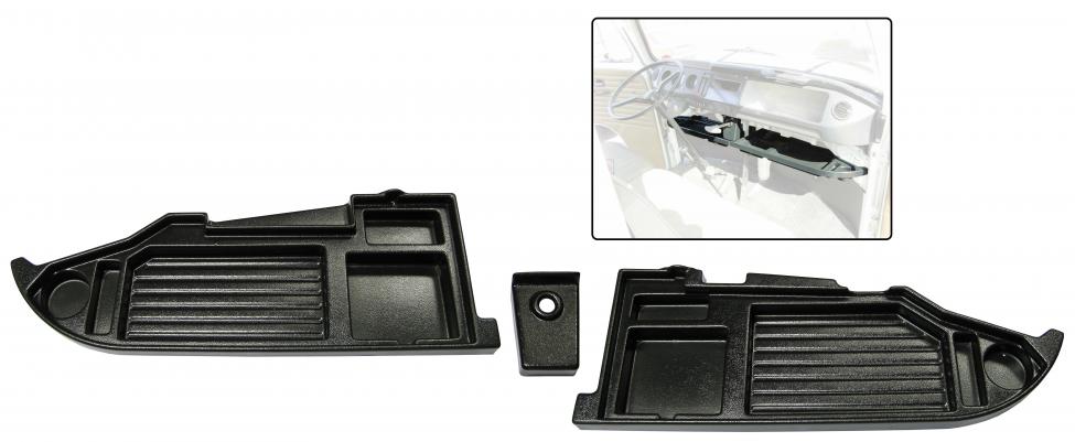 Rack under dash (ABS), the split bus is equipped with a storage compartment under the dashboard, after the model change in 1967, this handy storage was no longer present. A new resource for the accessory market was thus created, even you could purchase a storage rack as an option via the dealer. Most racks are not fitted with dividers so you stuff with every turn from left to right slide that is provided with this rack very different. There are various courses available for both small and larger items including two cup holders. The rack is made ??of molded black plastic (ABS) consists of two parts which once mounted is put on a middle part, where the parking brake is passed through to each other, this is also taken from a part of the hand brake mechanism out of sight. Supplied without mounting material, two bolts with nuts and washers plus 4 extra screws is all you need to assemble the whole.