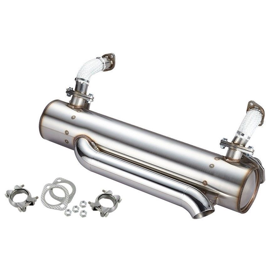 Výfuk je navržen a upraven pro snížený podvozek (jediný v nabídce) a je určen pro rychlé motory. Celý je vyroben z nerezové oceli 100% AISI 304. Konstruován je tak, aby nebyl výfuk vidět, pouze koncovka, která je leštěná (vysoký lesk). Kromě toho má další pozoruhodné vlastnosti, které nemá žádný jiný výfuk - trubky jsou ohebné a nastavitelné (síla příruby 4 mm), proto je vhodný pro všehcny motory Typ 1 od standardních až po sportovní motory (výkon až 125 HP). Na obou stranách jsou připraveny otvory M8 x 1.5 mm pro montáž lambda sondy. Svody s průměrem trubek 38 mm pro lepší proudění výfukových plynů, ale bez předehřevu pro karburátory. Pokud má být zapojeno topení na výměníky tepla, je nutné použít pouze hliníkové trubky, které se natvarují podle potřeby.